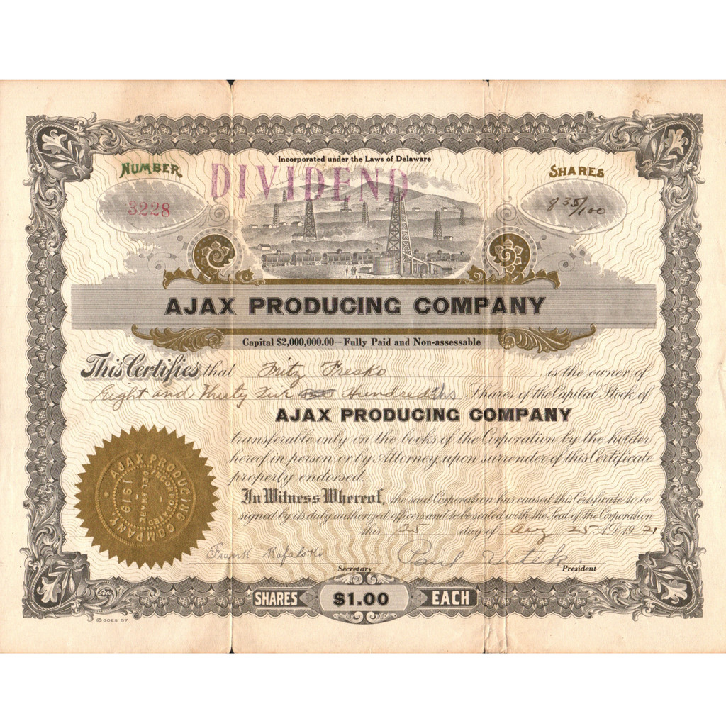 1921 Vintage Ajax Producing Company Stock Certificate Dividend Memorabilia