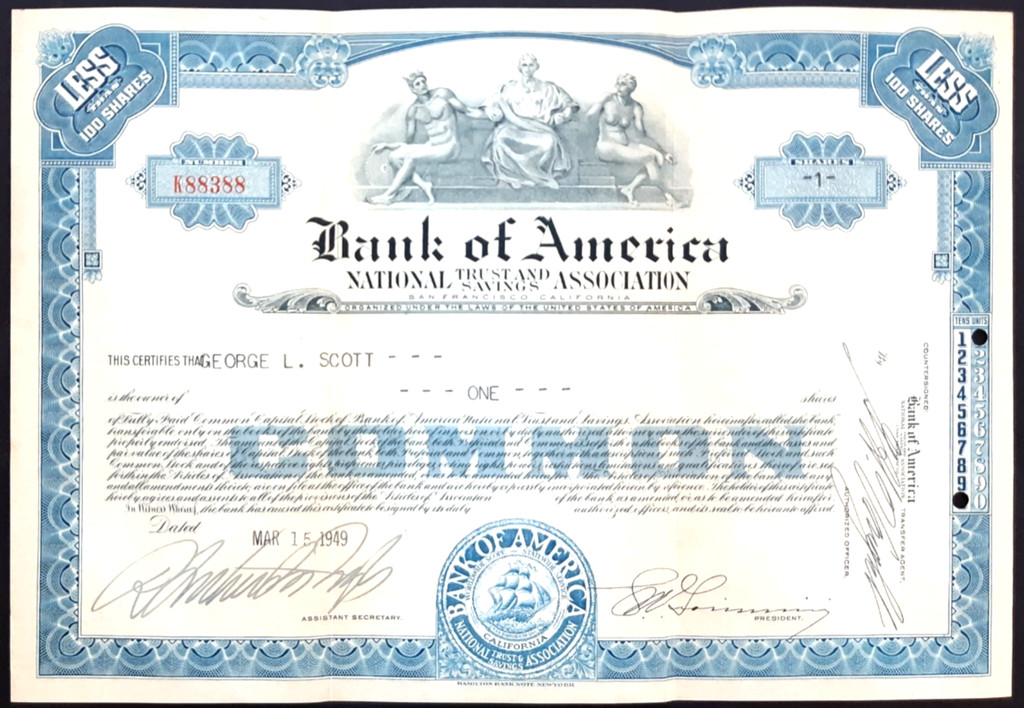 Early Bank OF America 1949 Stock Certificate San Francisco Signed