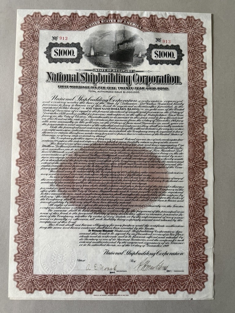 1898 National Shipbuilding Corporation $1 000 Twenty Year Gold Bond Certificate