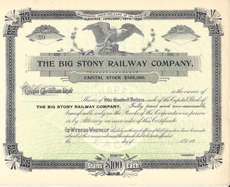 Stock/Bond: The Big Stony Railway Company....1890'S Unissued Stock Certificate