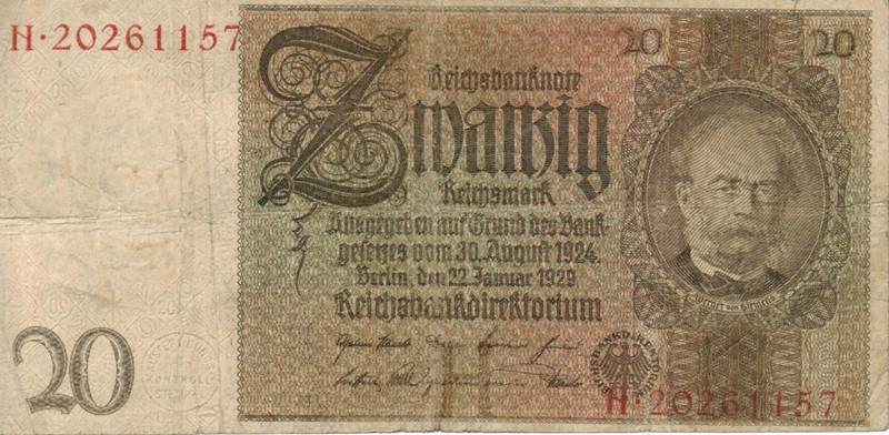 Banknote: 100% Authentic 20 German Reichsmark Note From Ww 2 1929, P0114