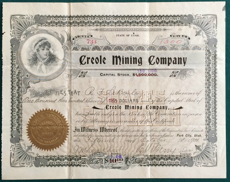 Stock/Bond: Uncommon Stock - 1901 Creole Mining Company - Park City Utah - $1300