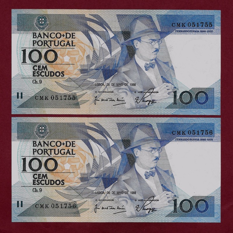 Banknote: Portugal 2 X 100 Escudos 1988 Gem Unc P-179 Running Numbers Gem Unc