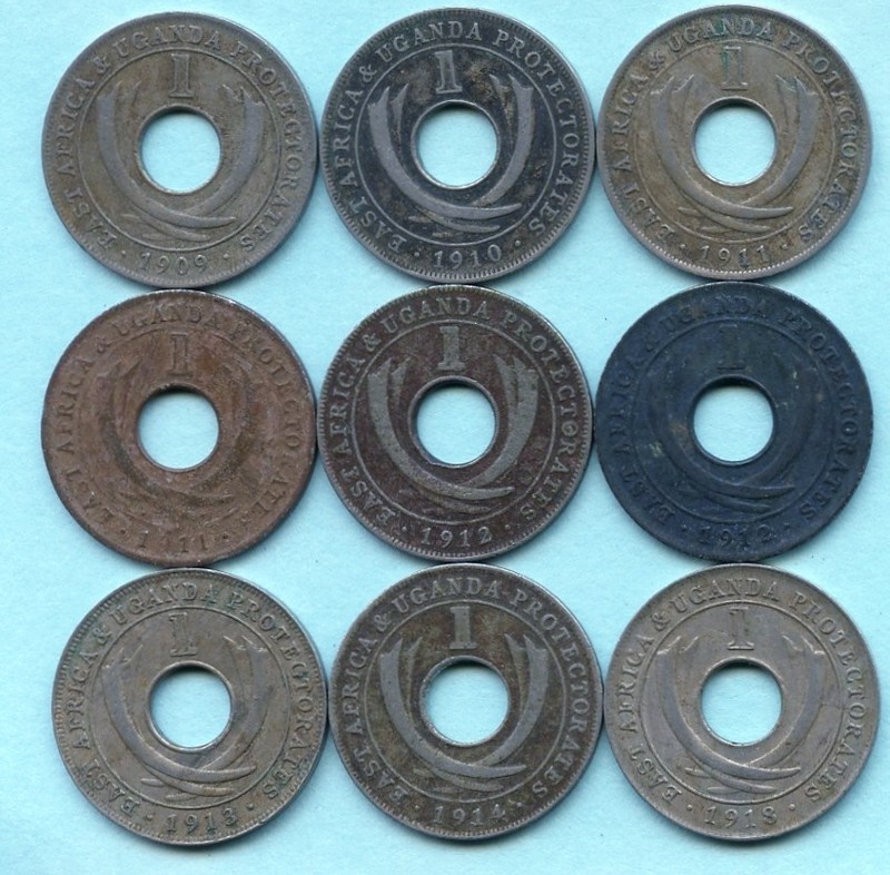9 Uganda 1 Cent Coins 1909 1910 2 Of 1911 2 Of 1912 1913 1914 & 1918