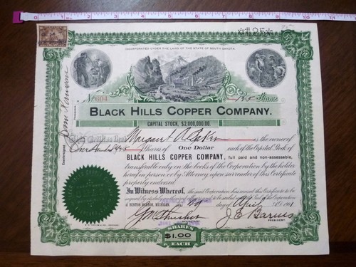 Stock/Bond: ~ 1901 South Dakota Stock Certificate ""Black Hills Copper Company"" W/Tax Stamp