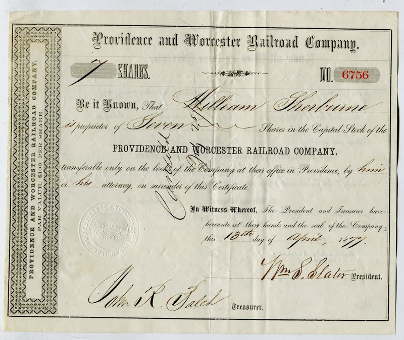 Stock/Bond: Providence & Worcester Railroad Co. 1877 7 Shares
