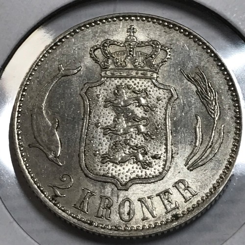 Coin: 1916 Denmark Silver 2 Kroner Dolphin Almost Uncirculated Coin