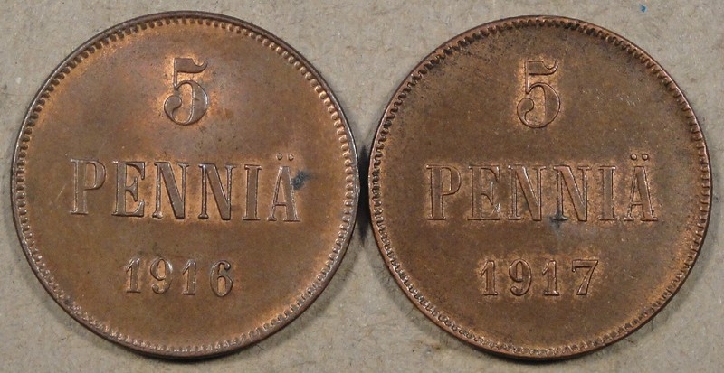 Coin: Finland Under Russian Occupation 1916 5 Penni + 1917 5 Penni Civil War Coin Nice