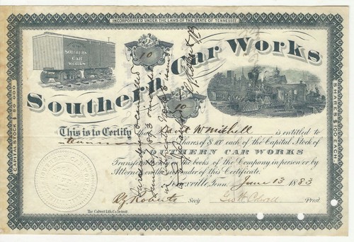 Stock/Bond: 1883 Southern Car Works Stock Certificate #10 Tennessee Rare * Pays Cancer Bills