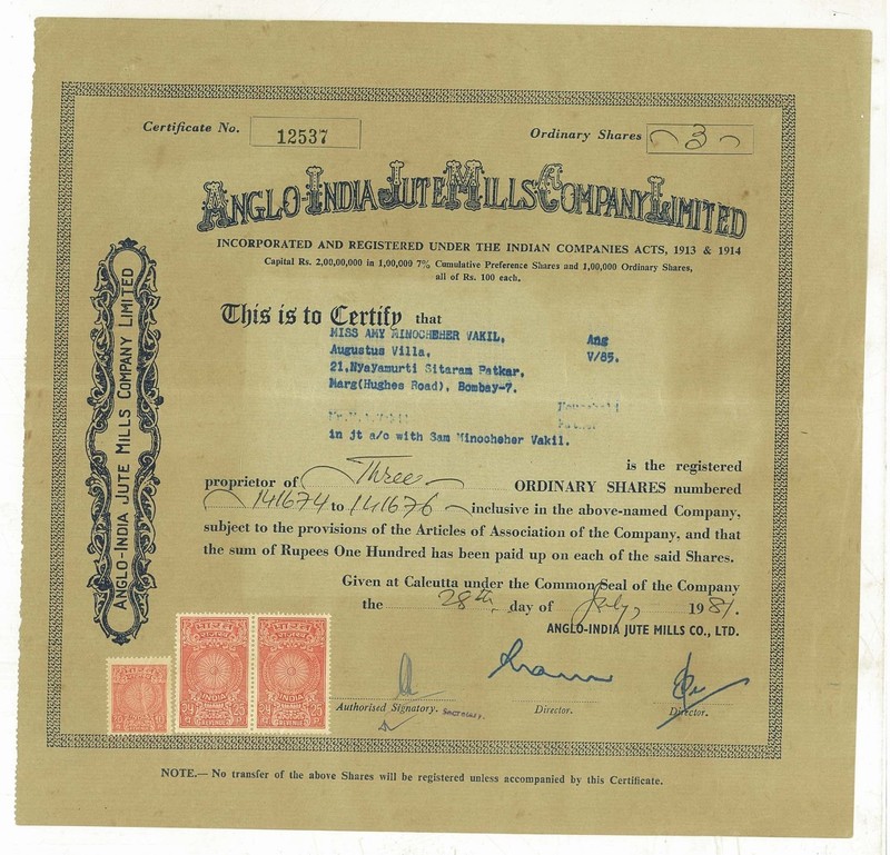 Stock/Bond: Anglo India Jute Mills Company Limited # 1981 Share Certificate (12537)