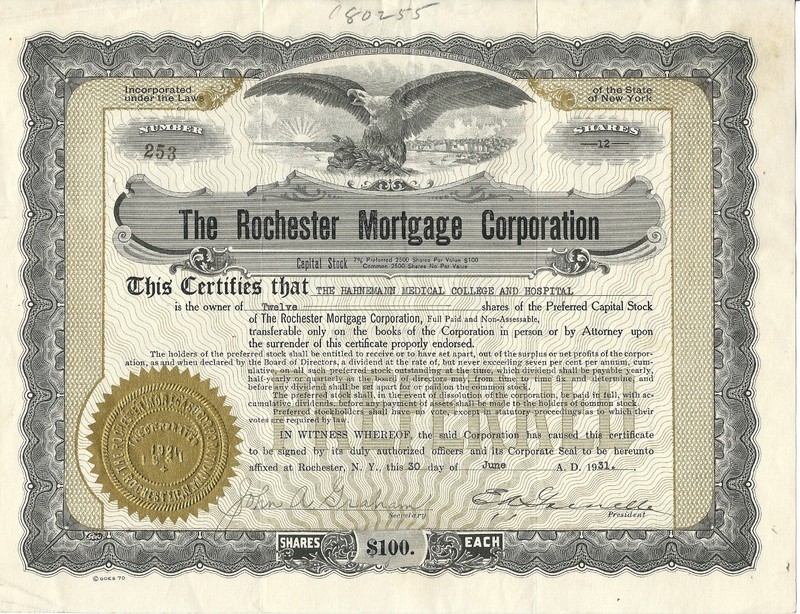 Stock/Bond: New York 1931 The Rochester Mortgage Corporation Stock Certificate