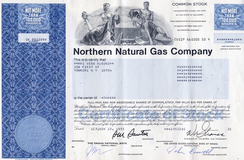 Stock/Bond: Northern Natural Gas Company Stock Certificate - Delaware 1975