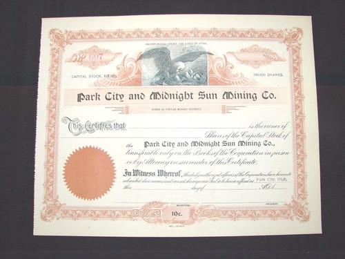 Stock/Bond: 1900'S Park City And Midnight Sun Mining Company Stock Certificate Utah New