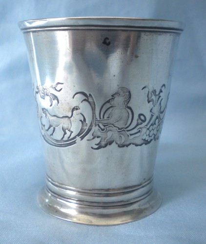 Superb Antique Engraved 1854 Coin Silver Beaker Cup Mint Julep Dog Man Griffin