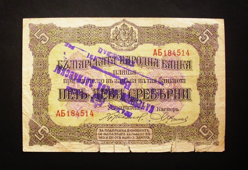 Banknote: Bulgaria - 5 Leva Silver,Nd(1917),Pick#21,Handstamp Yugoslavia,Fine,Scarce!