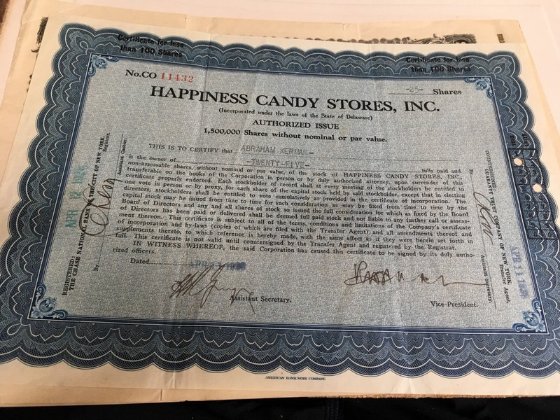 Stock/Bond: Happiness Candy Stores Inc. Stock Certificate (Delaware) 25 Shares 1926