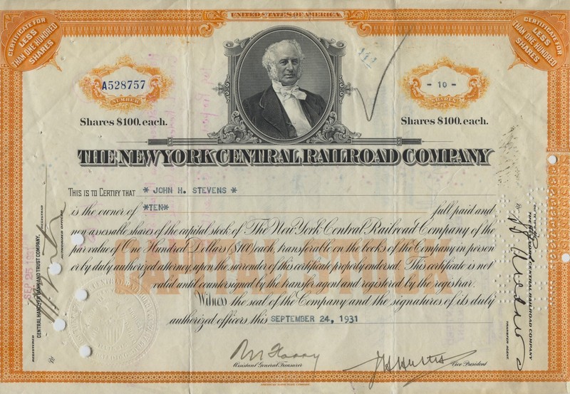 The New York Central Railroad Company Capital Stock 10 Shares Of $100 1931