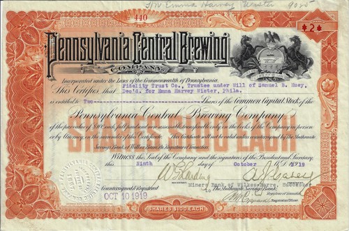 Stock/Bond: Pennsylvania 1919 Pennsylvania Central Brewing Company Stock Certificate
