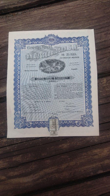 Stock/Bond: Rare Mexico 1919 La Descubridora,S.A. Mining Company Share Certificate & Coupons