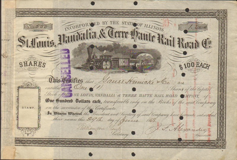 Stock/Bond: St Louis Vandalia Terre Haute Rail Road 1868 Gauss Hunicke Hat Langenberg Hoiles
