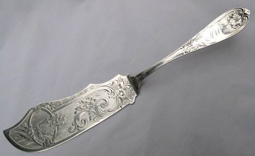 Goldsmith Early American Ornate Scenic Coin Silver Fish Slice Server Knife 1867