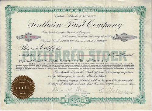 Stock/Bond: 1915 Indian Territory Southern Trust Company Stock Certificate Atoka