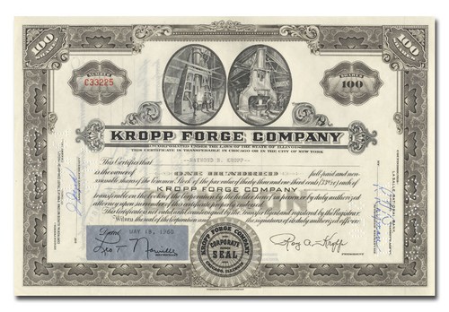 Stock/Bond: Kropp Forge Company Stock Certificate Issued To Raymond B. Kropp
