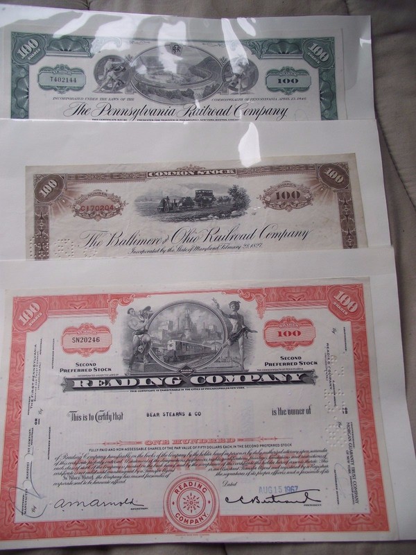 Stock/Bond: Railroad Stock Certificates ( Set Of 3) Baltimore Ohio, Reading, Pennsylvania