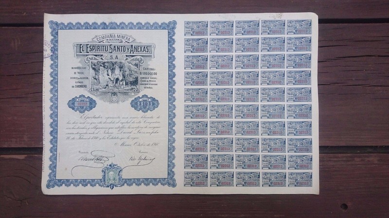 Stock/Bond: Rare Mexico 1910 El Espiritu Santo Y Anexas Mining Company Share Cert. & Coupons