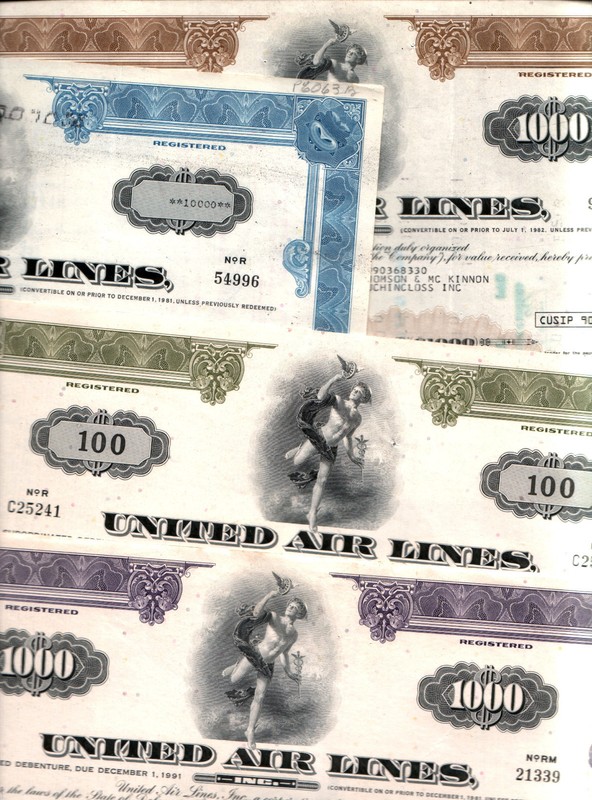 Stock/Bond: Set Of 4 Rare Art Deco United Airlines Bonds! 4 Dif Colors! ""Friendly Skies"" Era