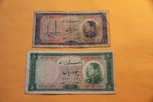 Pair Iran Persia P.66 Shah Pahlavi 50 Rials P.64 10 Rials 1954 Banknotes Rmc 163