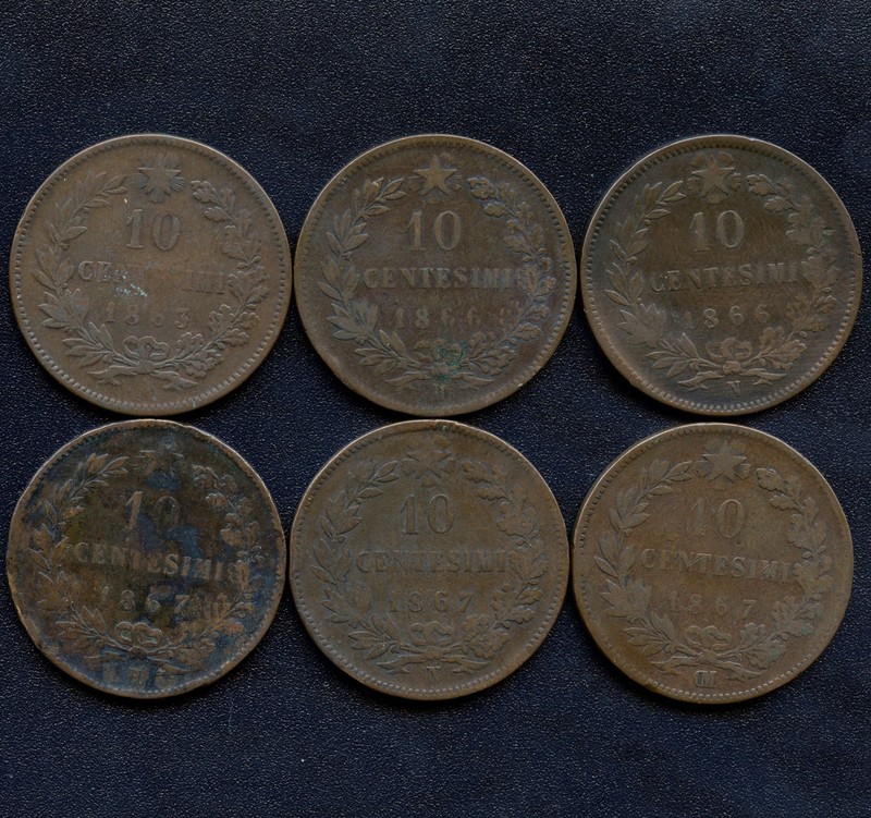 Coin: Italy 1863 1866 'H' 1866 'N' 1867 'H' 1867 'N' & 1867 'Om' 10 Centesimi Coins