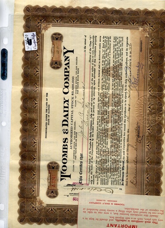 Stock/Bond: 1926 Freeport Illinois Toombs And Daily Company Stock Certificate