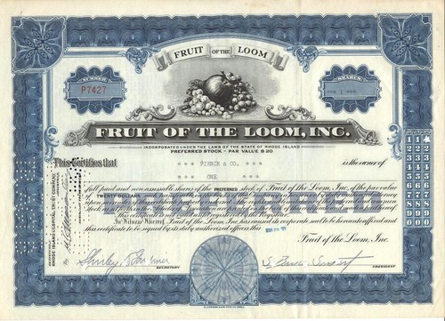 Stock/Bond: Antique Stock Certificate,""Fruit Of The Loom"",1957, With Beautiful Vignette