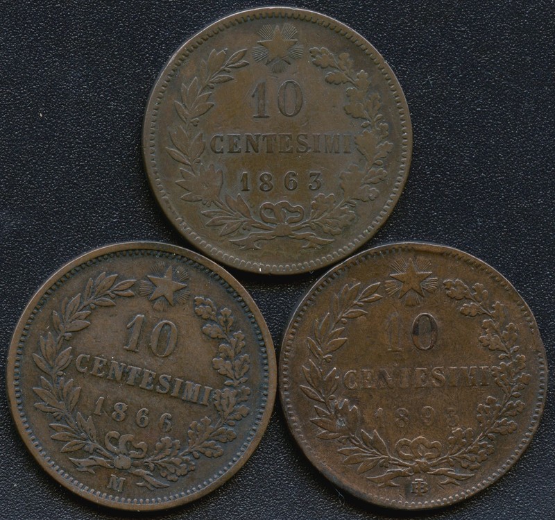 Coin: Italy 1863 1866 'M' & 1893 'Bi' 10 Centesimi Coins