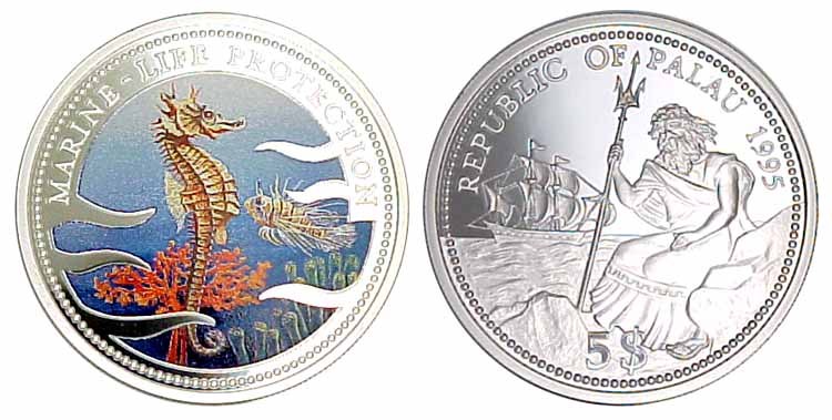 Coin: 1995 Palau Large Color Silver $5 Sea Horse/Neptune/Sailing Ship