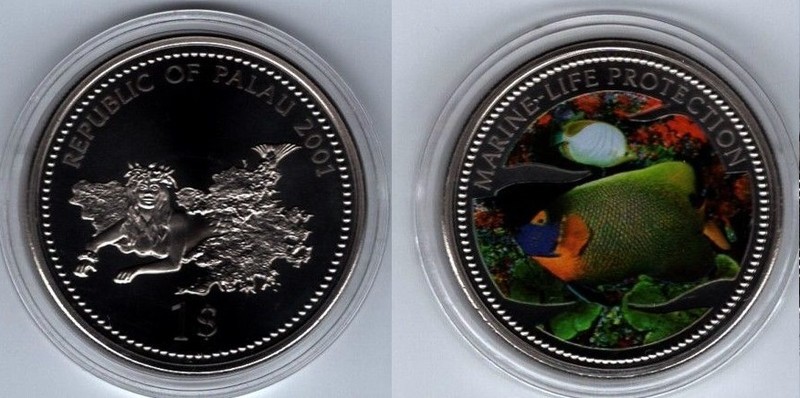 Coin: 2001 Palau Large Color $1 Greenish Tropical Fish/Bare-Breasted Mermaid