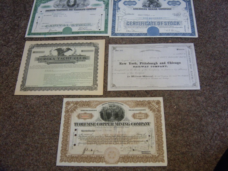 5 Stock Certificates Att American Sugar, Pittsburgh Railway, Eureka Yacht Copper