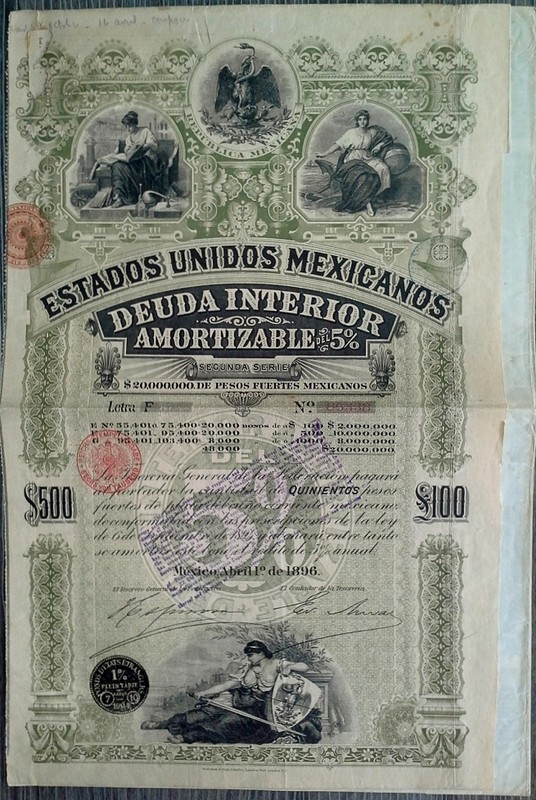 Stock/Bond: Mexico 1896 Estados Unidos Mexicanos Green Lady 500 $ Deuda Interior Bond Loan