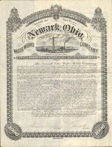 Stock/Bond: Newark Ohio Water Works Company > 1887 $1,000 Bond Certificate Stock Share