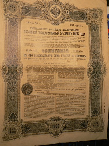 Stock/Bond: Russia'S Imperial Bonds Dated 1906 + Certificate Original Value 500 Gold Francs