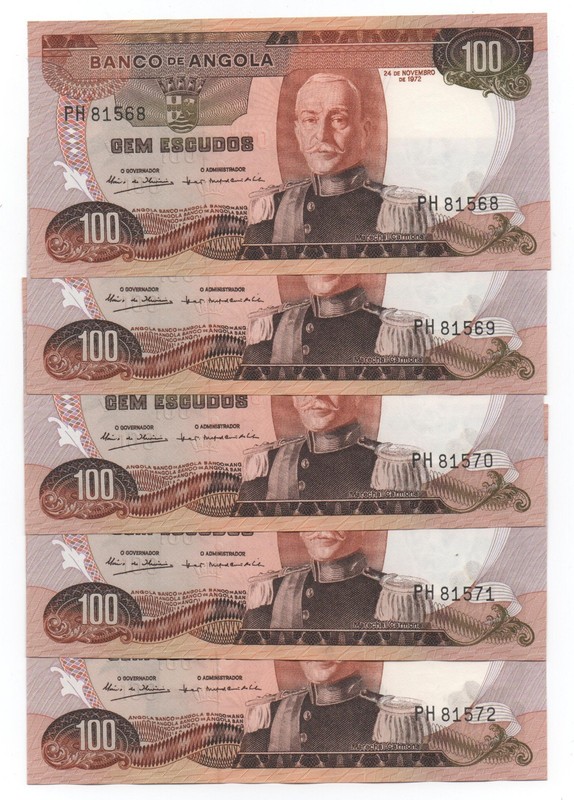 Banknote: Angola Portugal 5 X 100 Escudos 1972 Pick 101 Unc Running Numbers
