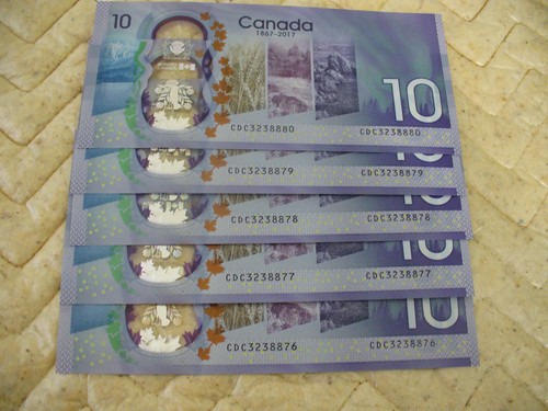 Lot Of 5 2017 10$ Canada Ten Dollar Bills 50$ Face Value In Sequence