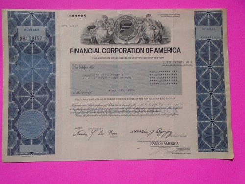 Stock/Bond: 1987 Financial Corporation Of America Stock Certificate American Bank Note 1000