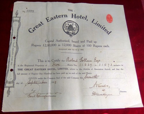 Stock/Bond: Great Eastern Hotel Limited 1918 1A Embossed Revenue Share Certificate Of 5
