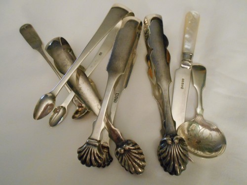 English Coin & Silver Plate 1 Lot 7 Pcs. Sugar Tongs, Caddy Spoon, Mustard Ladle