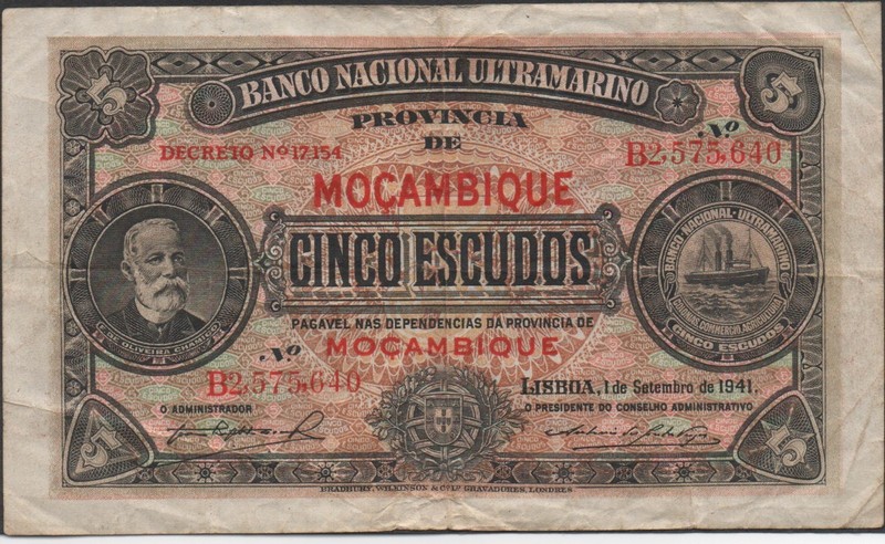 Banknote: Mozambique , 5 Escudos , 1.9.1941 , P 83 , Prefix B Circulated Banknote
