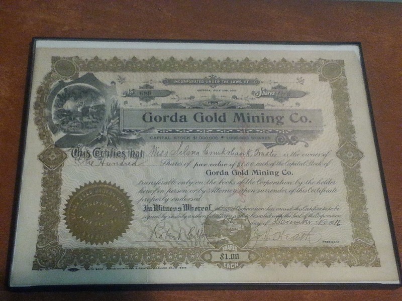 Stock/Bond: Antique Framed Stock Certificate Gorda Gold Mining Company 1916
