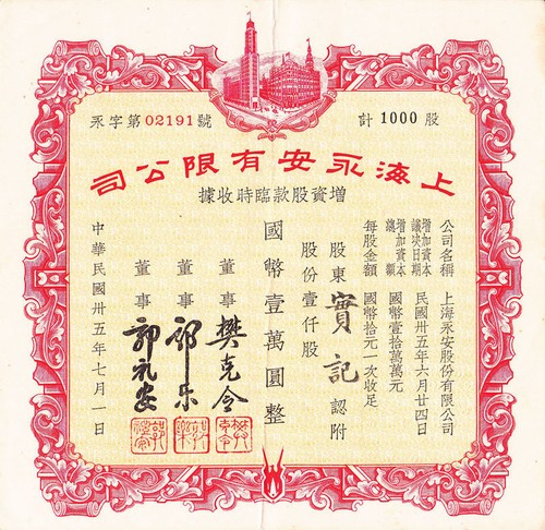 Stock/Bond: S1156, Wing-On Company Federal Inc, Stock Certificate 1946, 1000 Shares,Shanghai