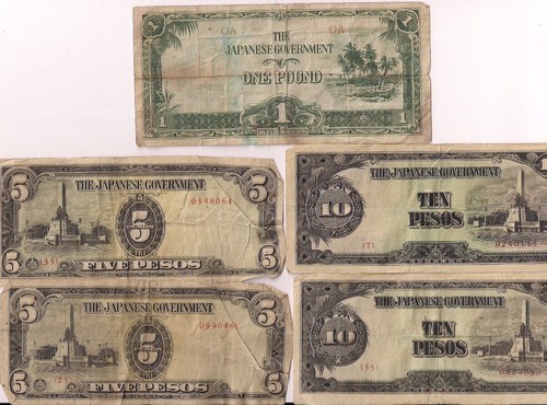 5 Japanese Occupied Philippines Bank Notes Wartime Currency 1 Pound * 30 Pesos